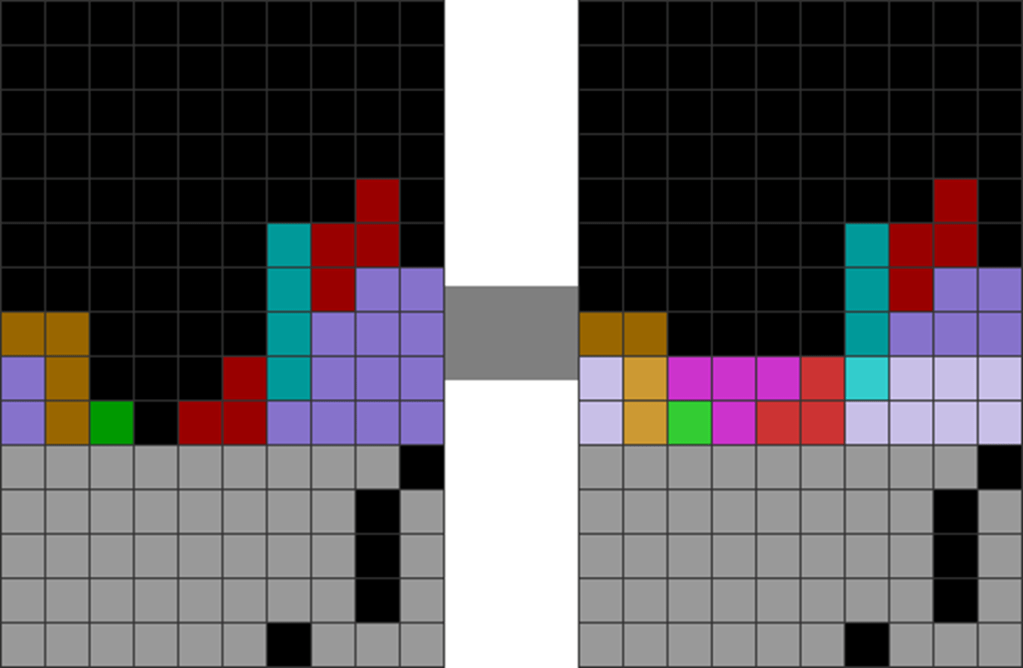 | The player upstacks a bit. | Then, he makes a double line clear with a T piece, producing only one garbage line’s output. |