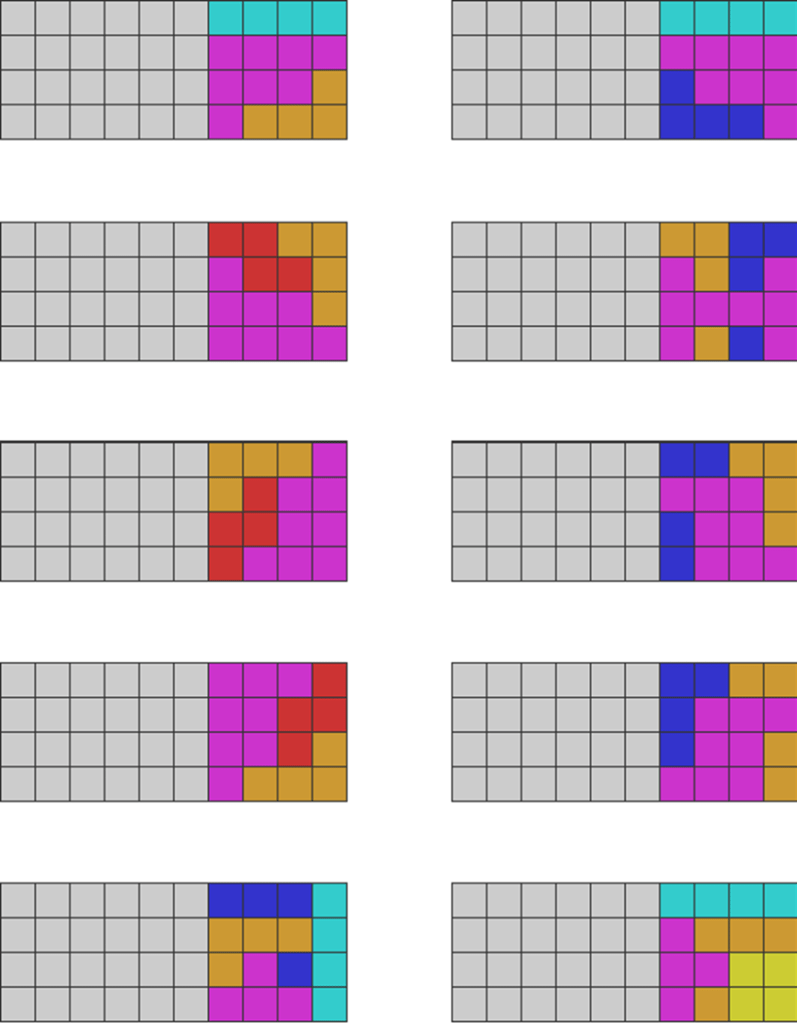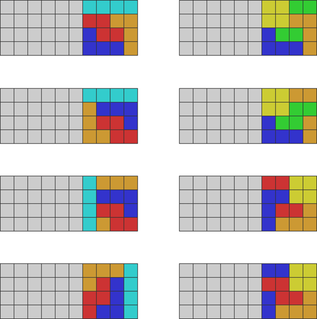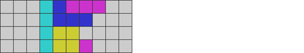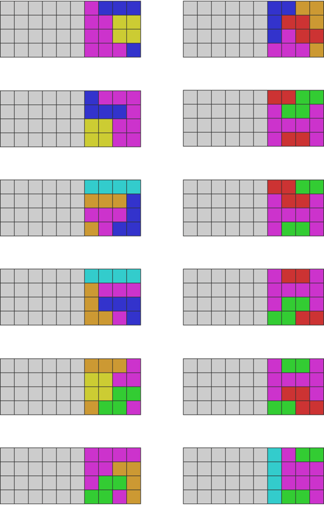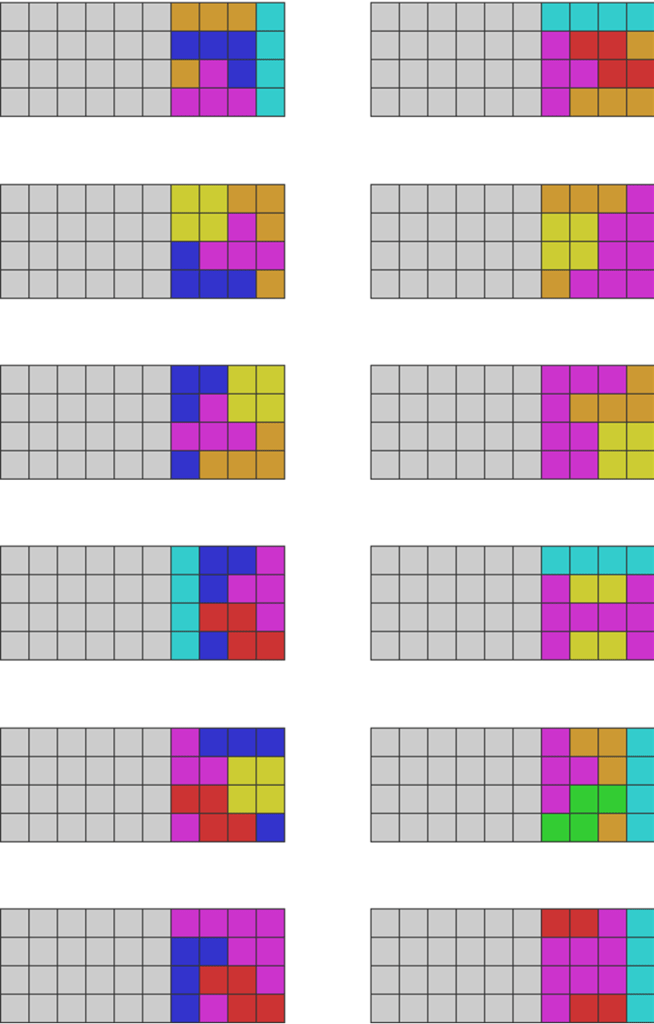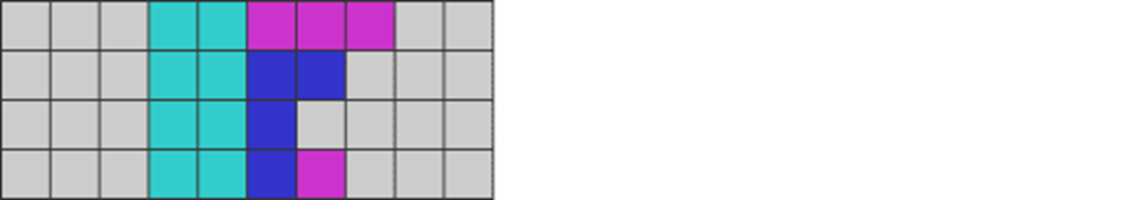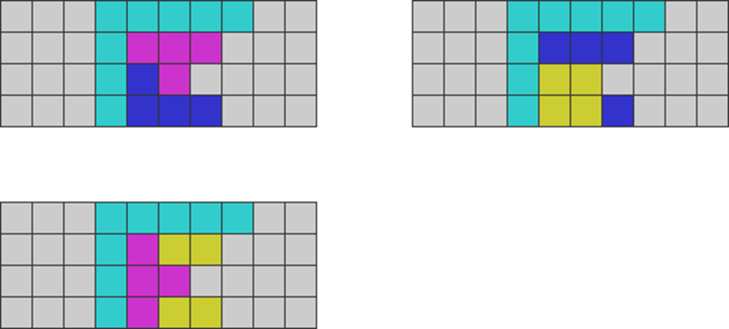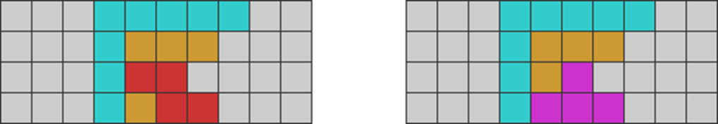 First, the number of L, J, and vertical T placements occupying the corners of a rectangular cavity must be even to create a perfect clear (minus rare exceptions, to be covered in the next book). Here’s an illustration: