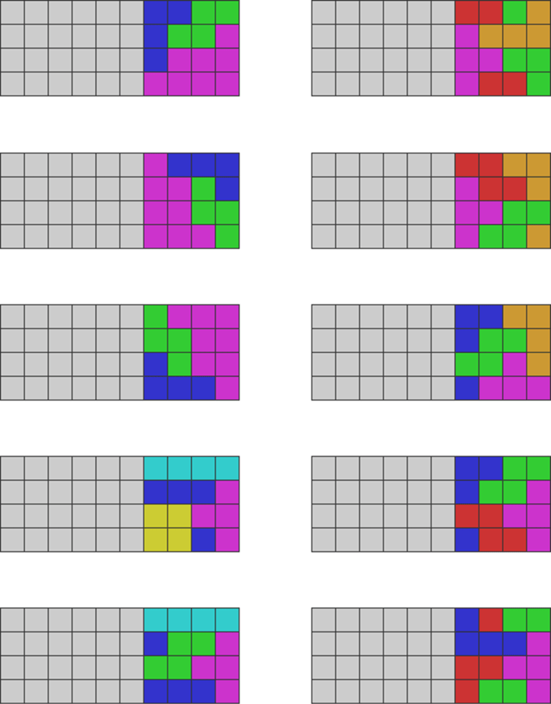 | Last two sets: After the I piece skim, the cavities left behind (each diagram set’s step 3) typically lead to many more perfect clear solutions. |