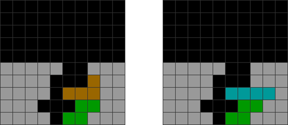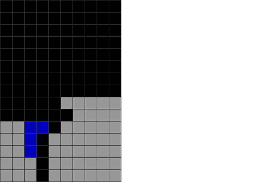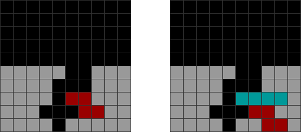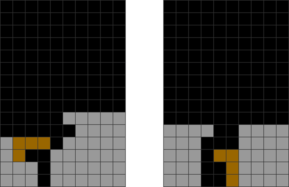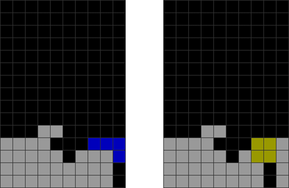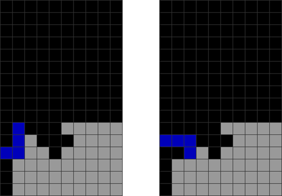 | The player spots a 3-wide gap and then places a horizontal S piece. He then builds the overhang, completing the STMB Cave. |