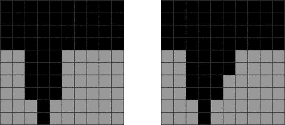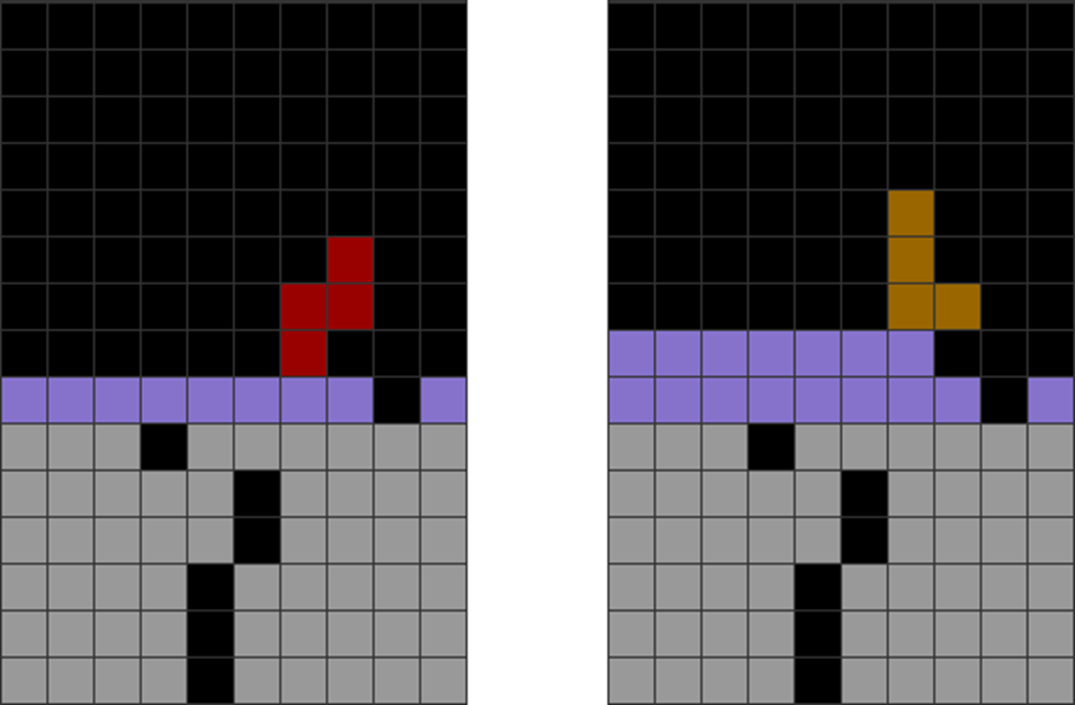 | See how the left and right stacks of column 4’s hole differ in a height of 2 blocks. The player has two choices. | The player can easily put the vertical S to create the Kaidan’s base and then finish it with an overhang. |