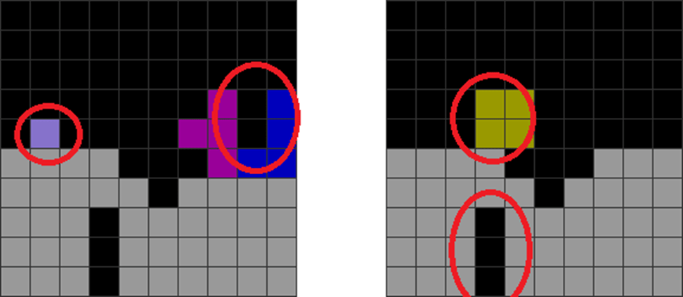 | A T-spin double donation has many jagged red-circled parts, which reduces stacking and downstacking smoothness later. | This case is worse. See the red circles. The O piece blocks the next garbage hole below and is thus unclean. The O overhang must be skimmed off, which breaks back-to-back bonus. This is inefficient. |