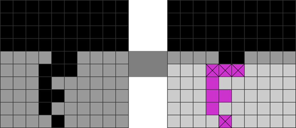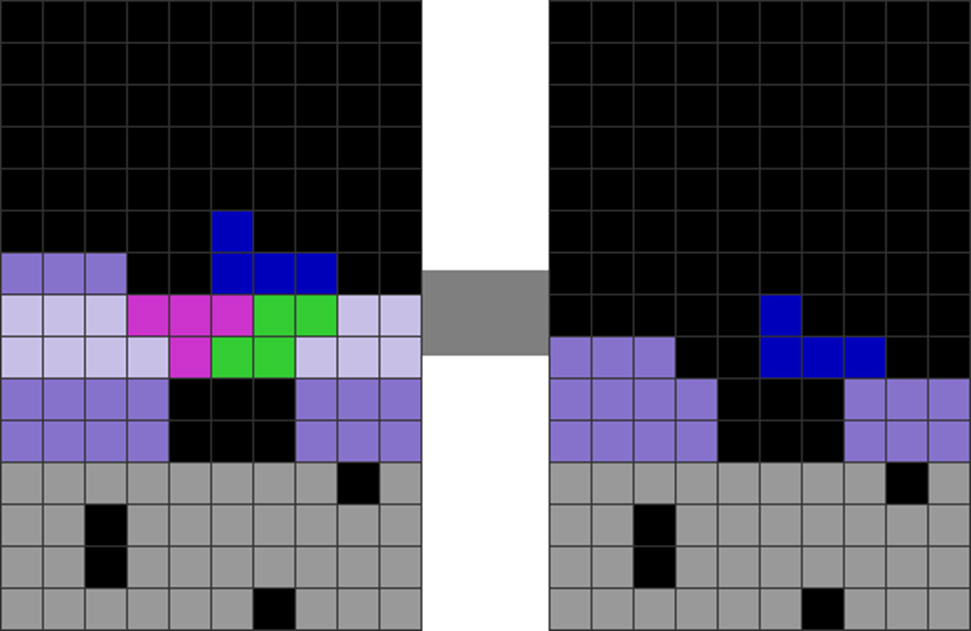 However, one can rotate the T vertically to deny the T-spin double and make a T-spin single instead. This levels out the field on both sides and lets one easily make another back-to-back T-spin double. This is shown in diagram set 12-19 in the following sections.