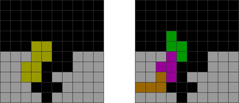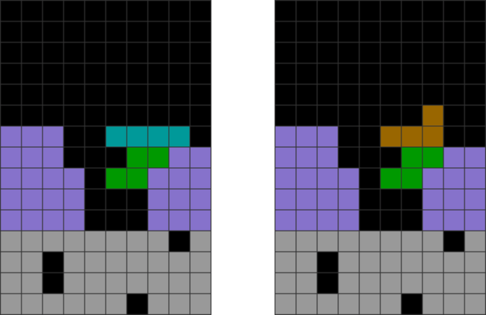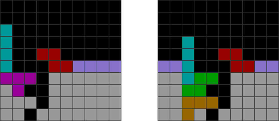 | Then, make overhangs on the far right with S and Z, creating a Parapet T-spin. | T-spin double. |