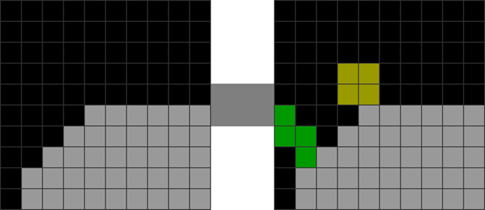 A gray bridge between the two steps connects them causally. Here, step 1 is the left diagram. After putting an S and O piece, it progresses to step 2 in the right diagram. The rest is self-explanatory. Gray blocks represent a generic shape. Yellows correspond to O pieces. Green corresponds to S pieces.