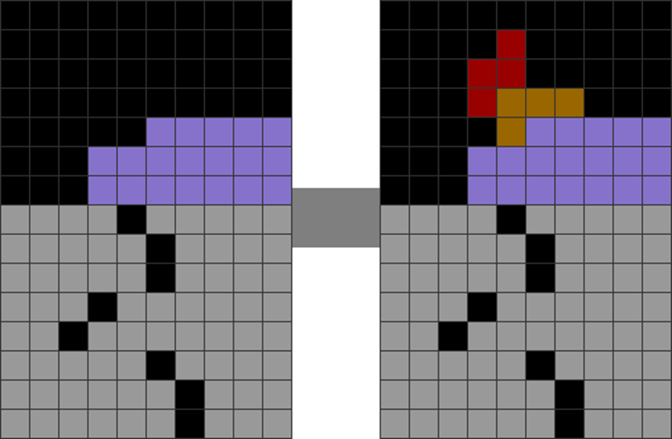 This is a 3-step sequence. The gray blocks represent garbage lines. The lavender blocks represent generic, non-garbage, upstacked blocks. I would then sometimes put colored, specific mino blocks on top of the lavender and gray blocks.