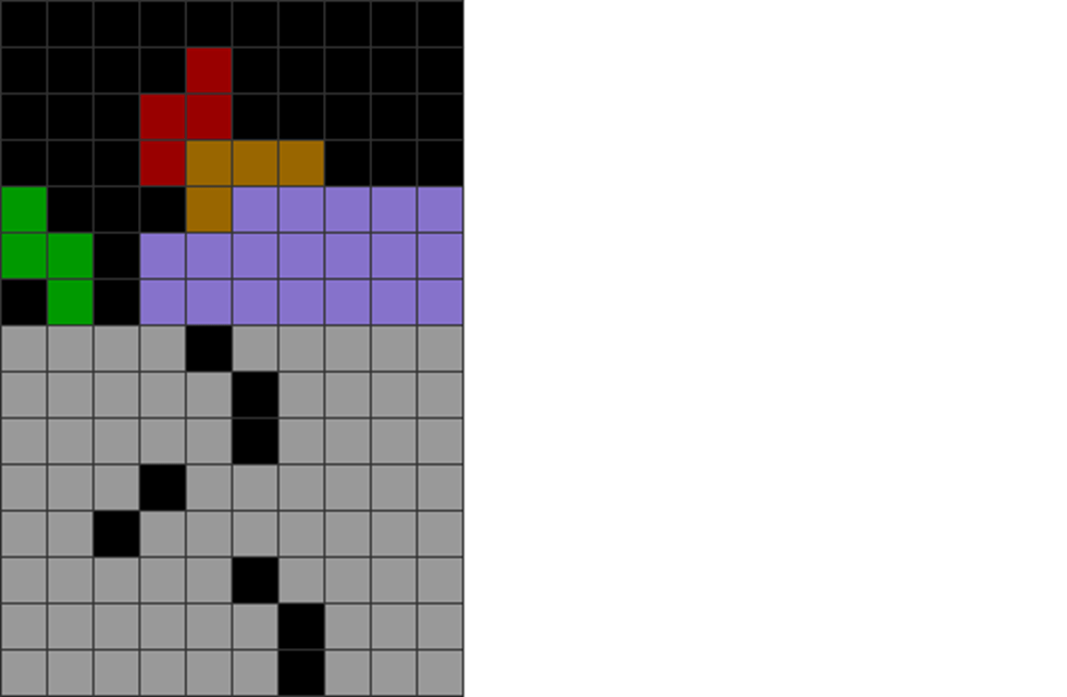 - Purple: T pieces or leftover blocks originally from T pieces after line clears.