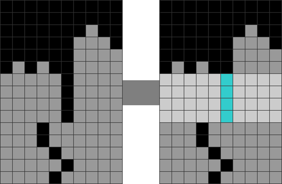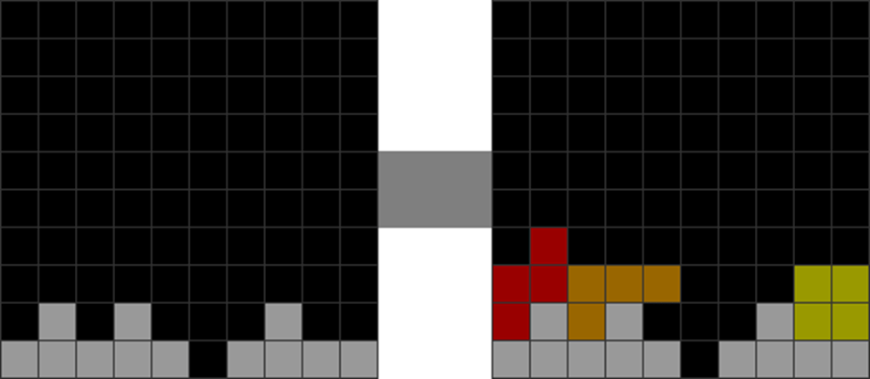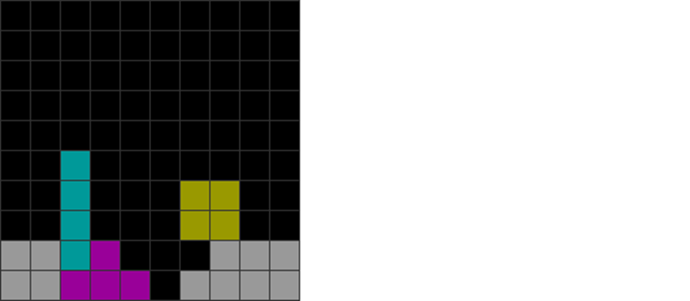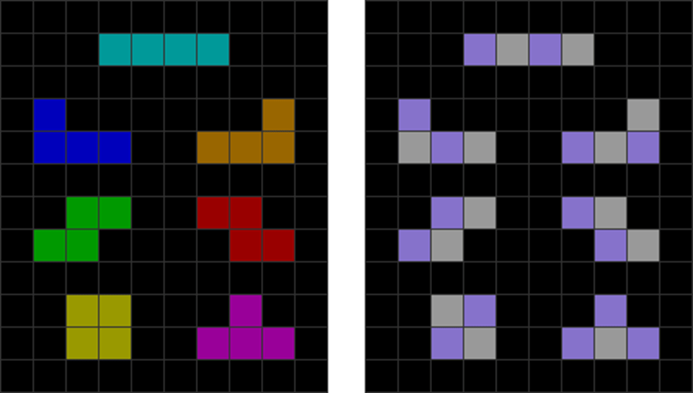 | Only the S, Z, T, and I minoes can be placed vertically and cleanly on the above parity-imbalanced stack. |