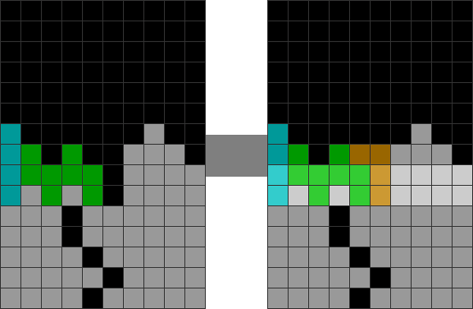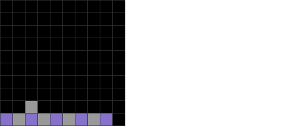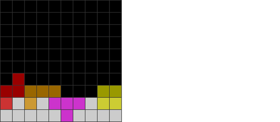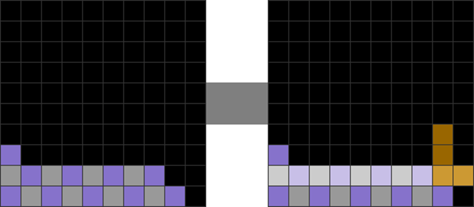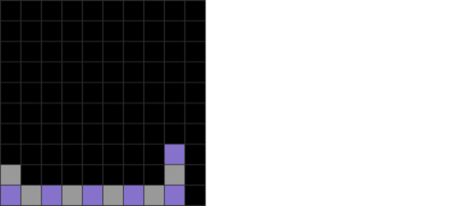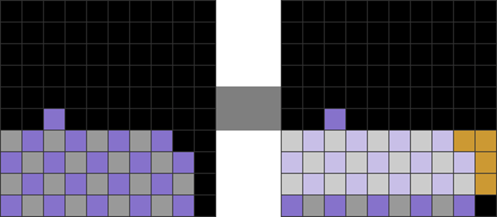 | Some singles can alter parity. At first, the difference between lavender and gray blocks is 2. After the single line clear with the L skim, it resets to 0 difference. |