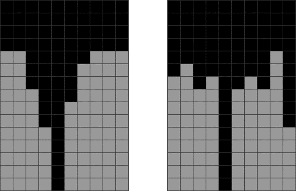 | The player gets into two piece dependencies (often I, L, and J to fill the holes) on the far left and right sides (red circles). | The player creates a mound-like pattern in columns 2 to 4. This leads to piece dependencies in the two red circles. |