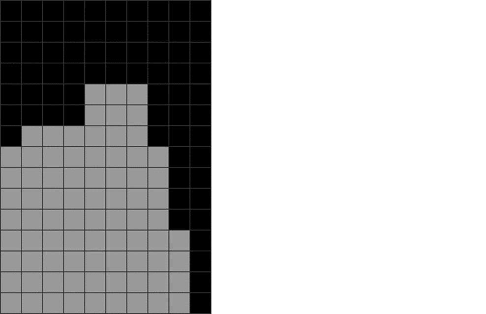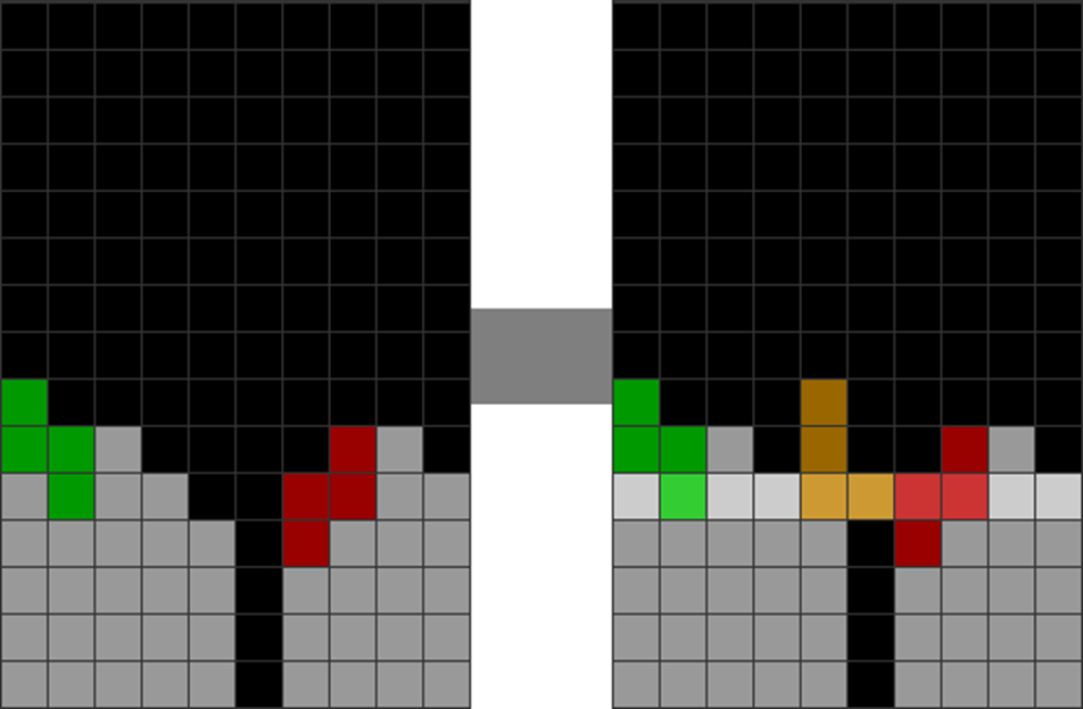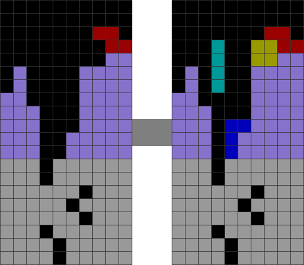 | This is the starting field. | This is the worst stacking choice, leading to a problematic follow-up pattern (requiring another Z or T to fill the cavity, which jags the field. |