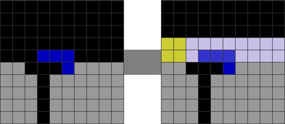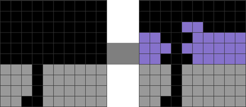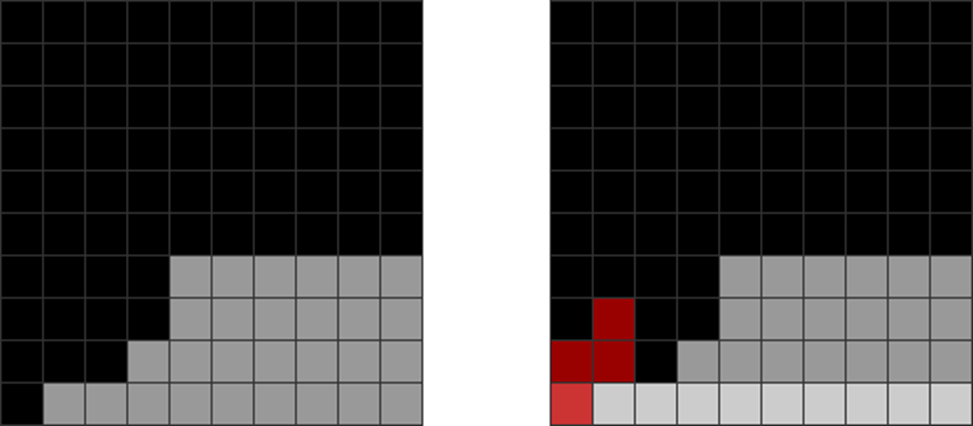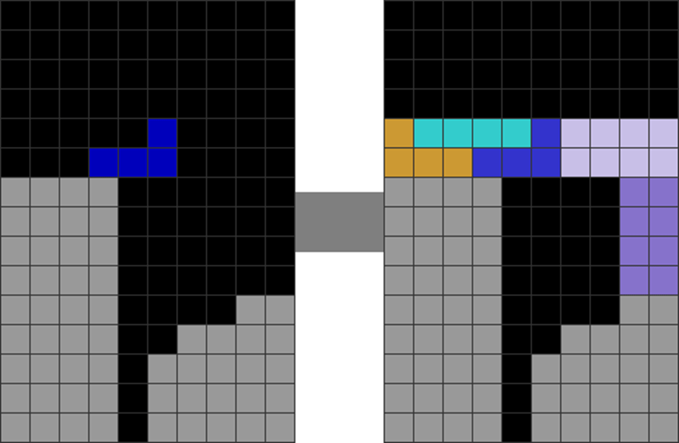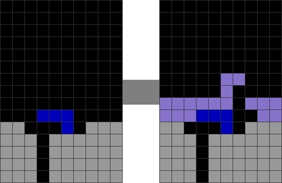 | This L placement leads to I-dependencies. There is no other place to put L cleanly. | The player places L this way, and soft drop tucks the J under the L piece. With another J, the player can sustain back-to-back bonus without skimming. |