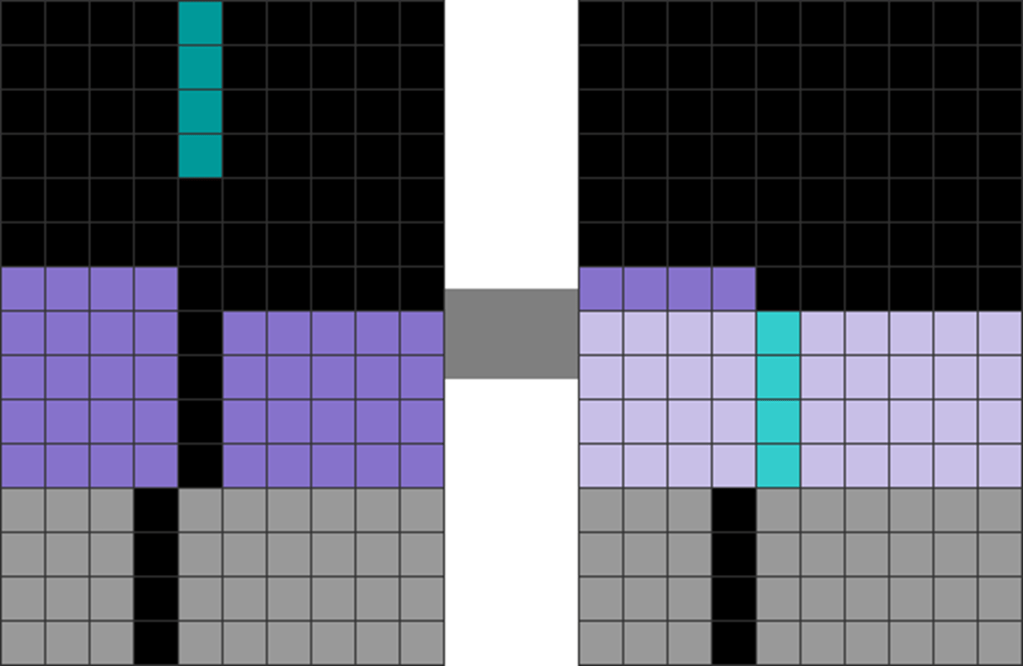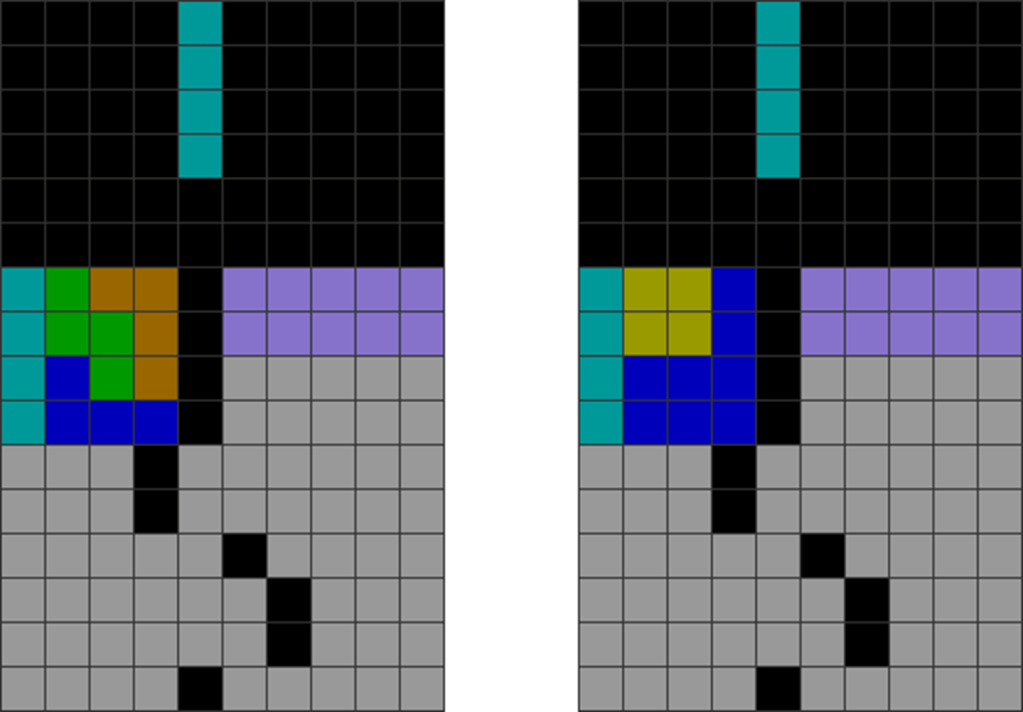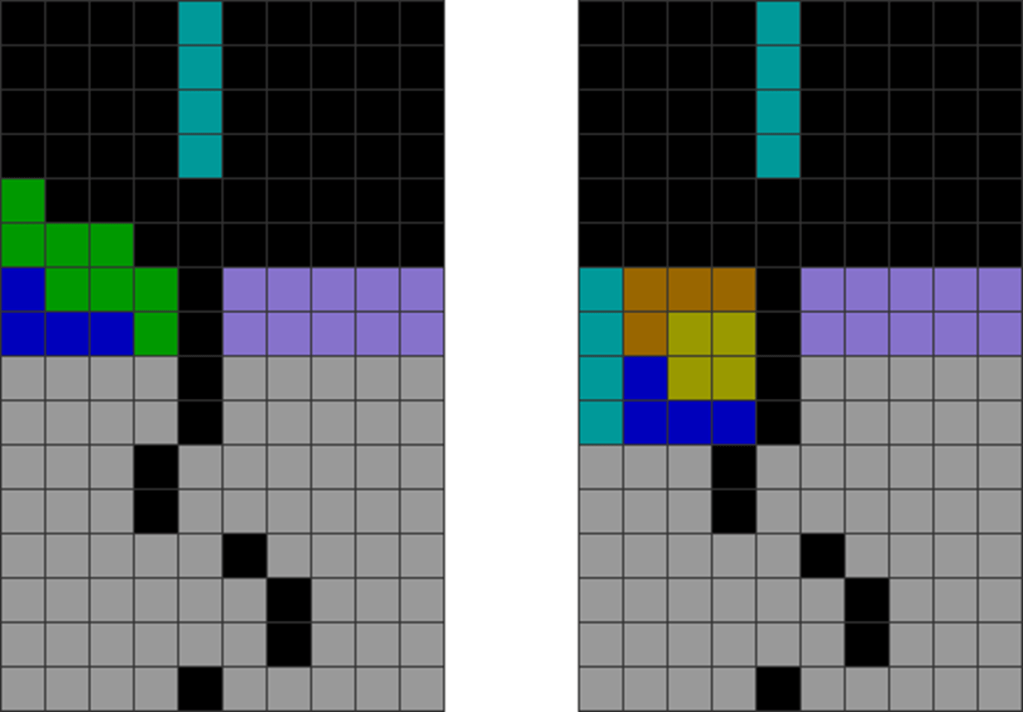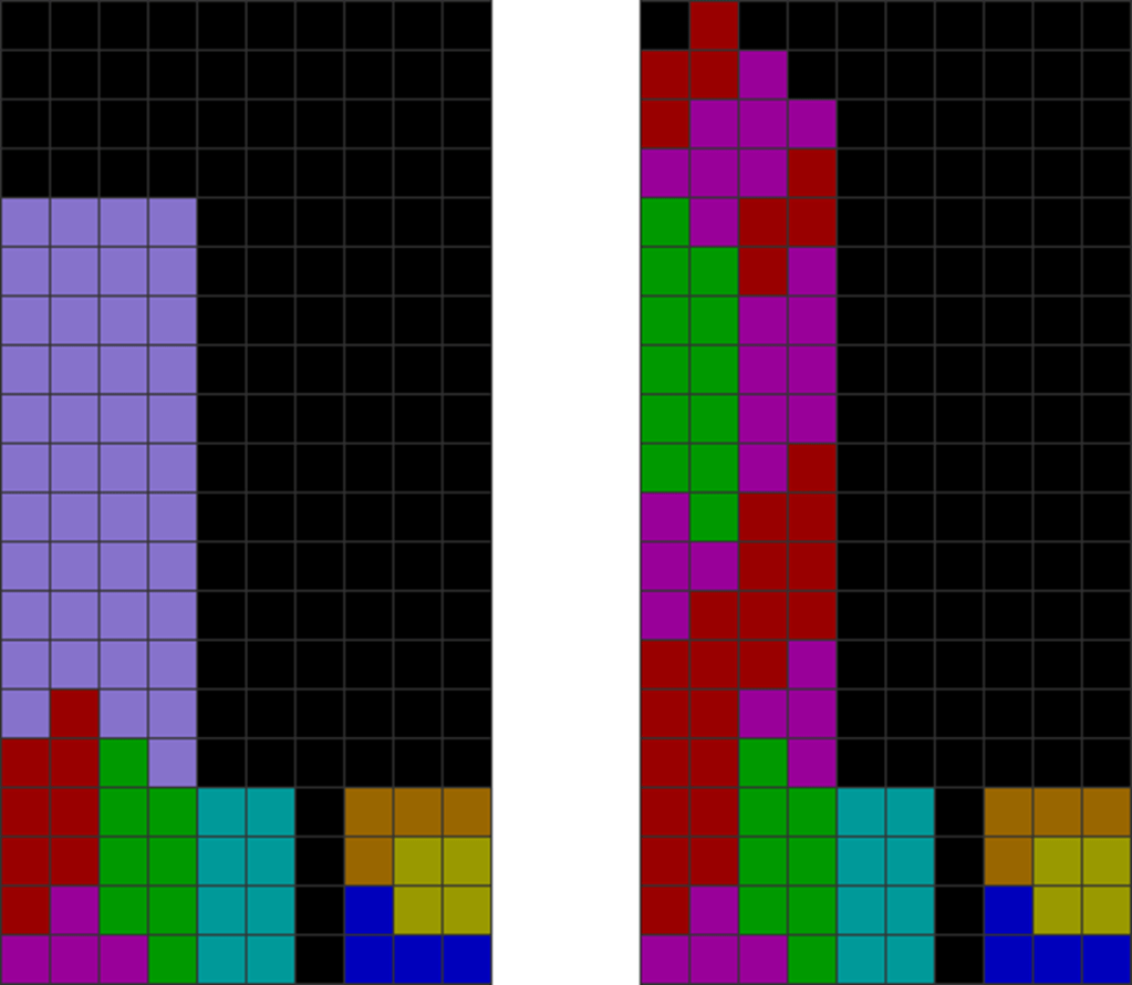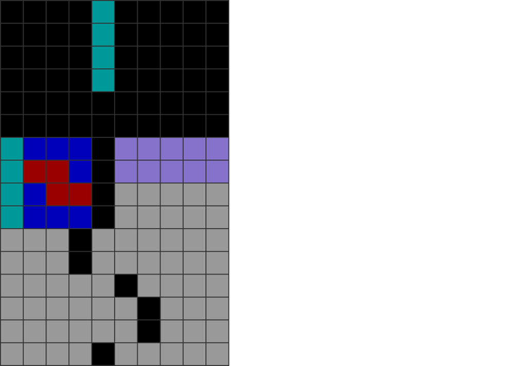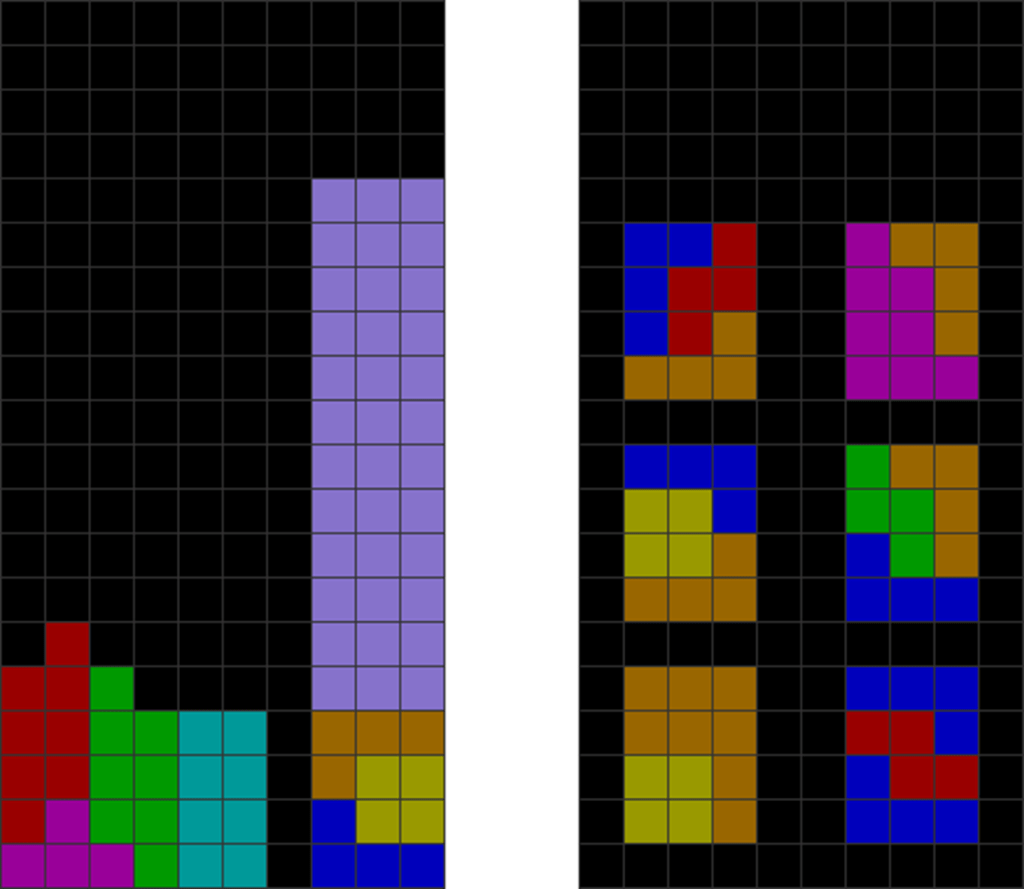 | You want to properly stack the first 4 columns (lavender blocks). | This can be done using S, Z, and T pieces in the configuration here. |
