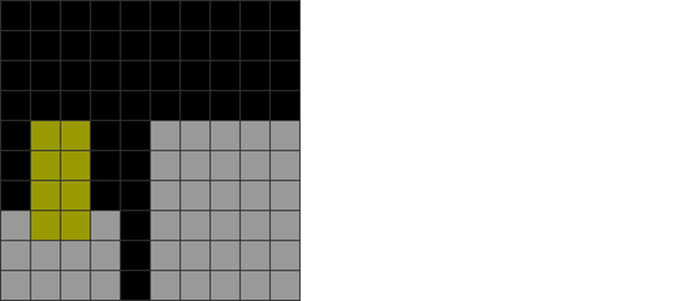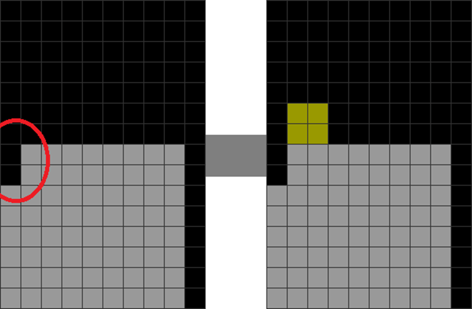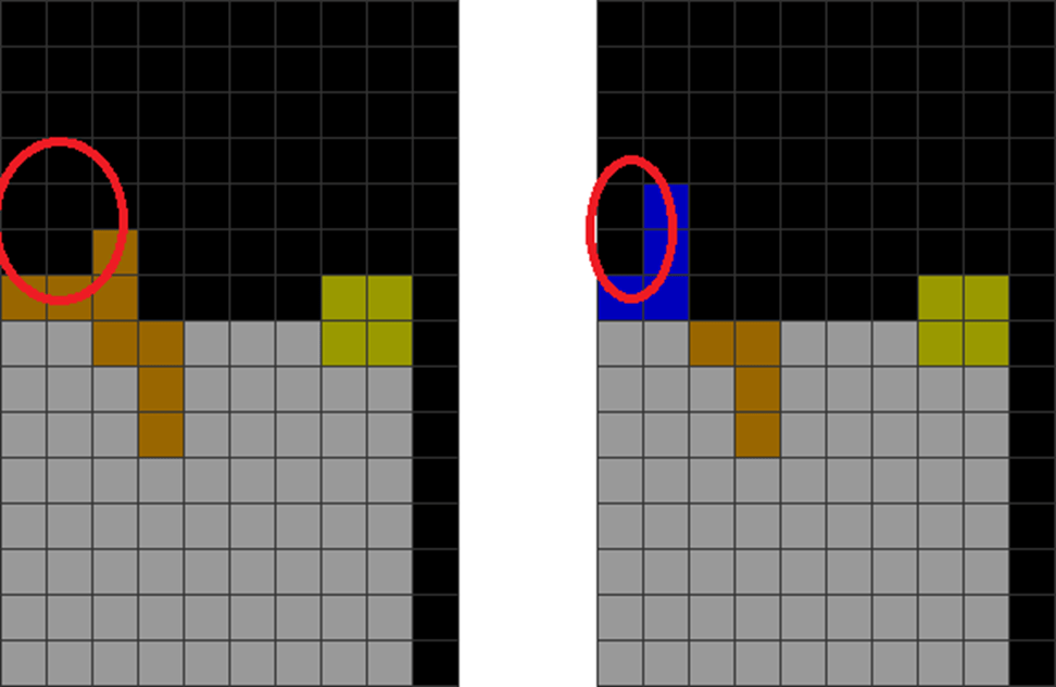 | The player fails to fill the cavity in the red circle. Instead, he puts an O piece, resulting in an I dependency in column 1. |
