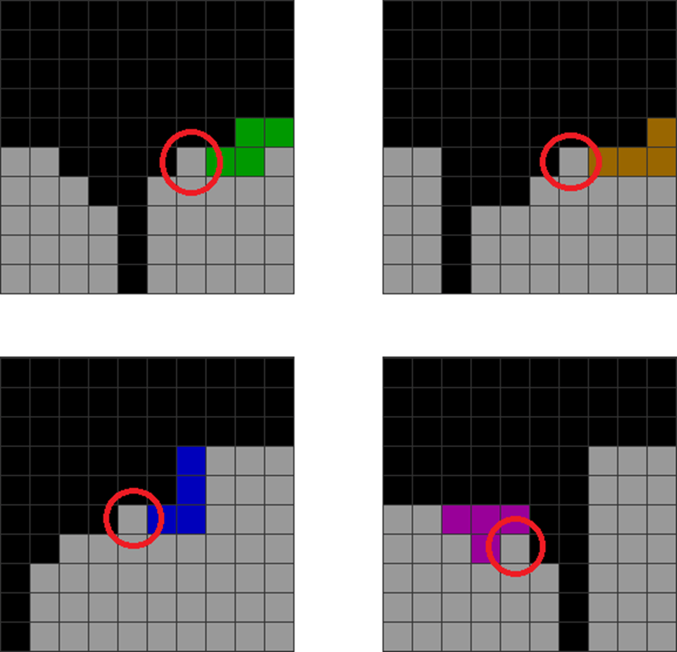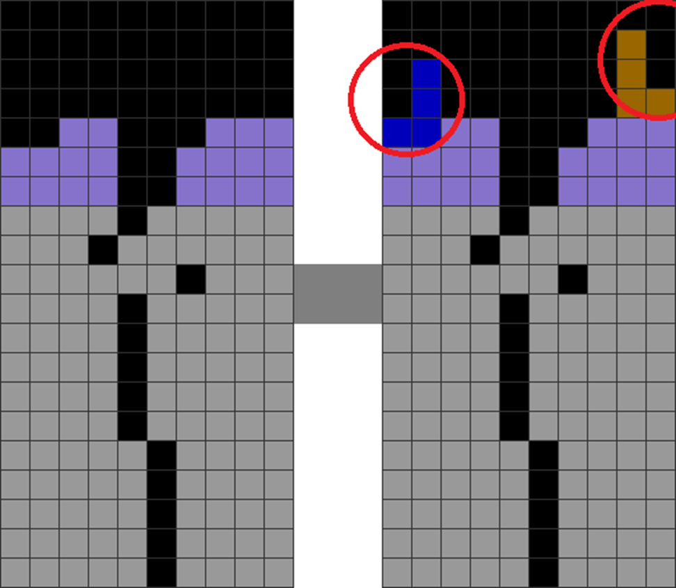 | This field is originally fairly clean. | The player puts vertical L and Js at the corners while stacking. This creates two piece dependencies in the red-circled areas. |