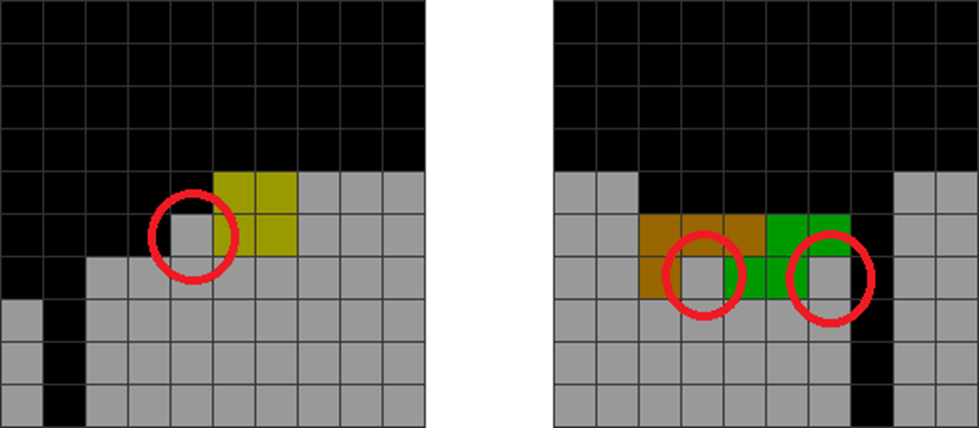 | An inexperienced player places the T in a non-jagged area instead, creating two jagged areas (red circles). |