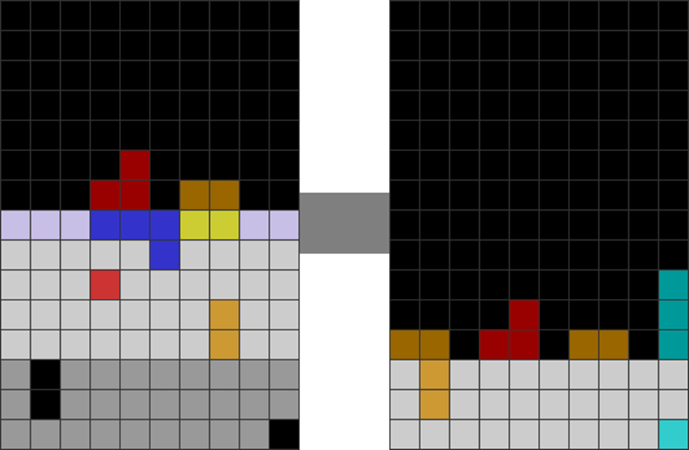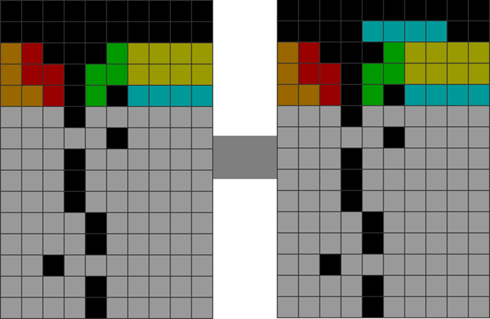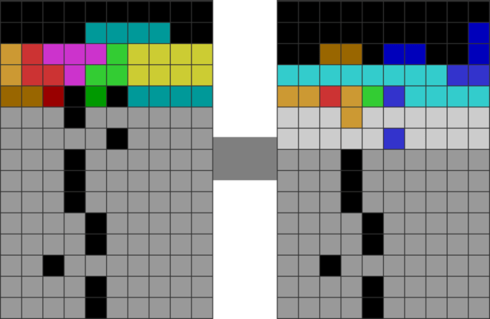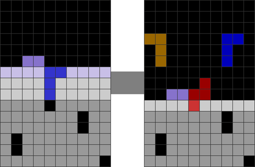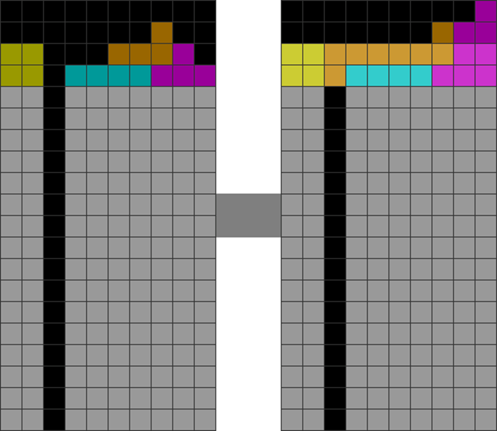 | The player receives incoming garbage. | He counterspikes by returning the opponent’s garbage, starting with a T-spin double and Tetris. He thus uses the colored blocks as fuel. |
