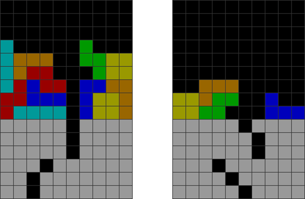 | These two examples show clean, parity-resolved stacking with simple T-spins. They are not overstacked, and the stack is balanced. |