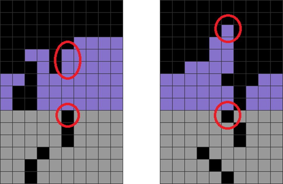 | The player goes for overstacked, greedy T-spins in these two examples. See how the red-circled overhangs stack over the red-circled garbage holes later? |