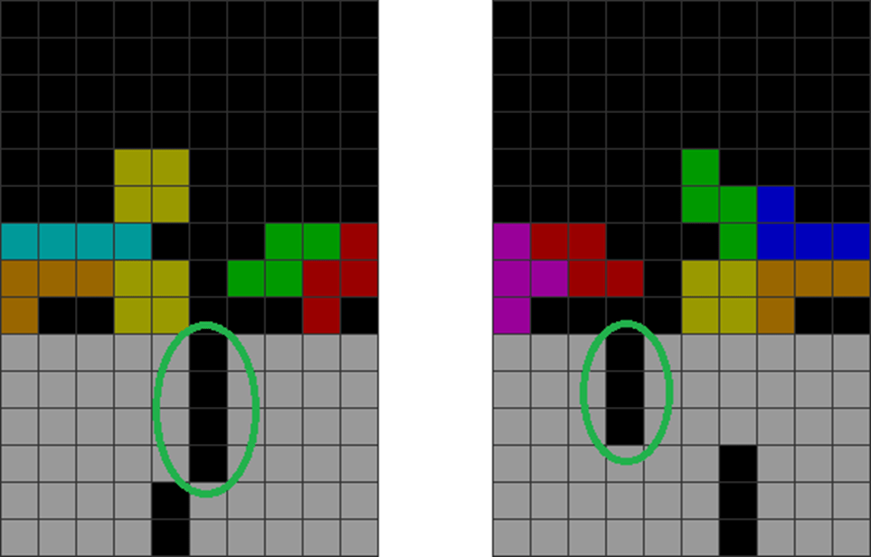 | Here, the player makes a T-spin double. | However, he messes up by putting the I over holes. |