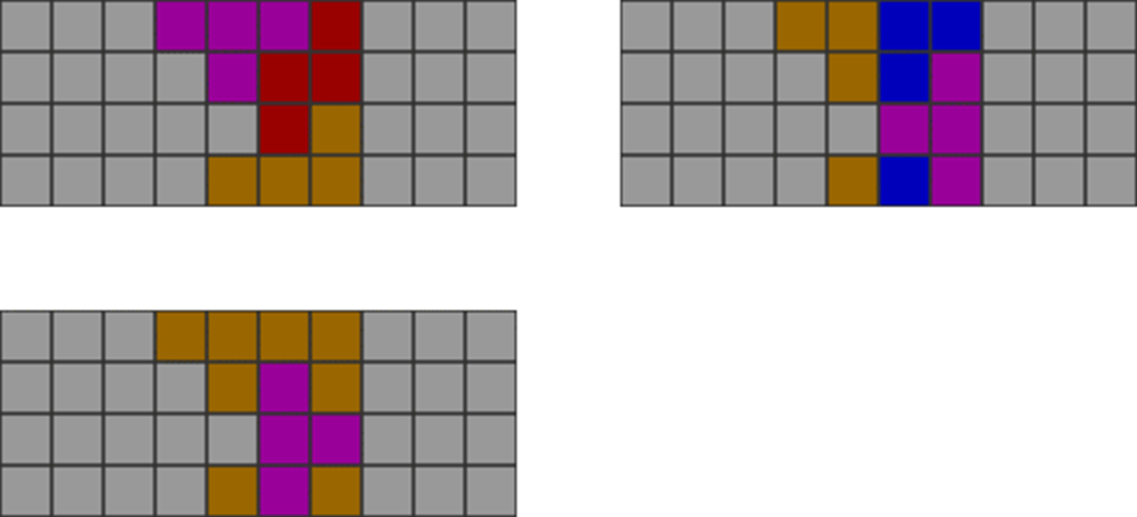 Notice how easy it is to stack the L, J, and O on the far right of each diagram. All A, B, and C have the same shape, regardless of how you orient L, J, and O.