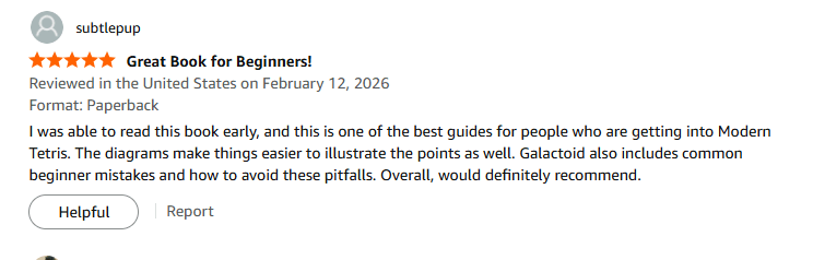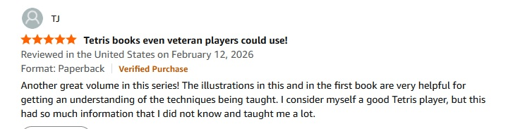 Intuitive. Descriptive. Swag. These books really have it all. I cannot stress that enough. These books lay out fundamentals of Tetris and build upon them in easy and digestible diagrams and descriptions. If I could go back in time to years ago and learn Tetris all over again, I would have picked up these books from the very beginning. Yet even as a veteran today, these books still offer articulate, eloquent chunks of knowledge that express my own wisdom into words on a page. I am sure that all levels of Tetris players have something to gain from reading these books, whether it is just another perspective, another setup or better yet: an enlightening paradigm shift in how you play the game.