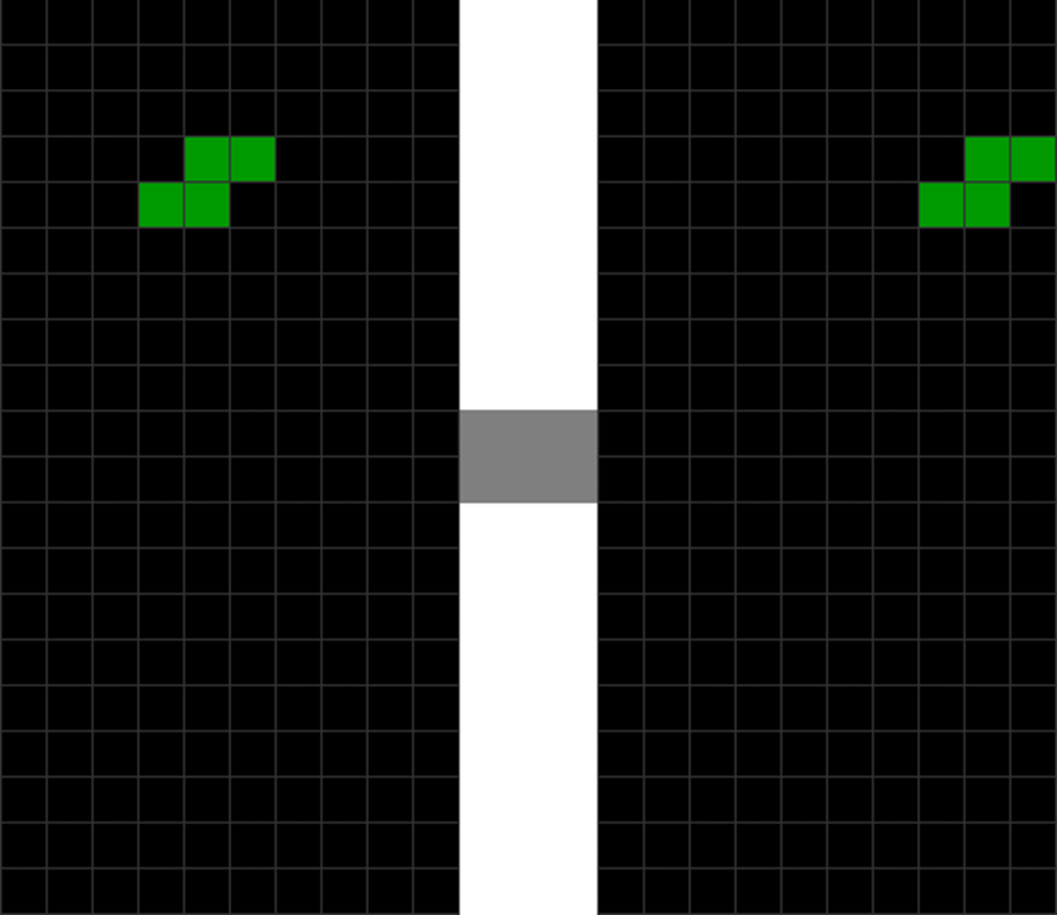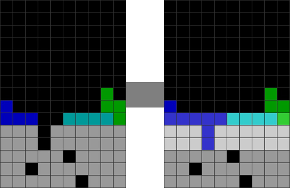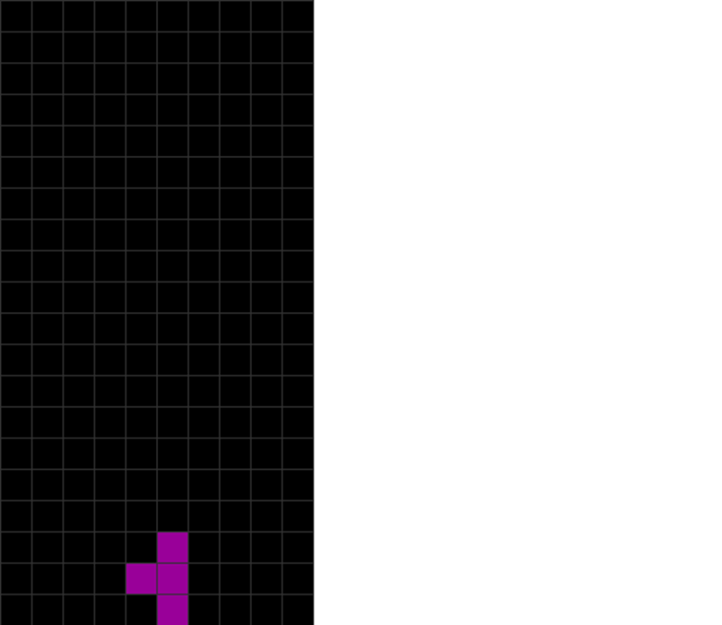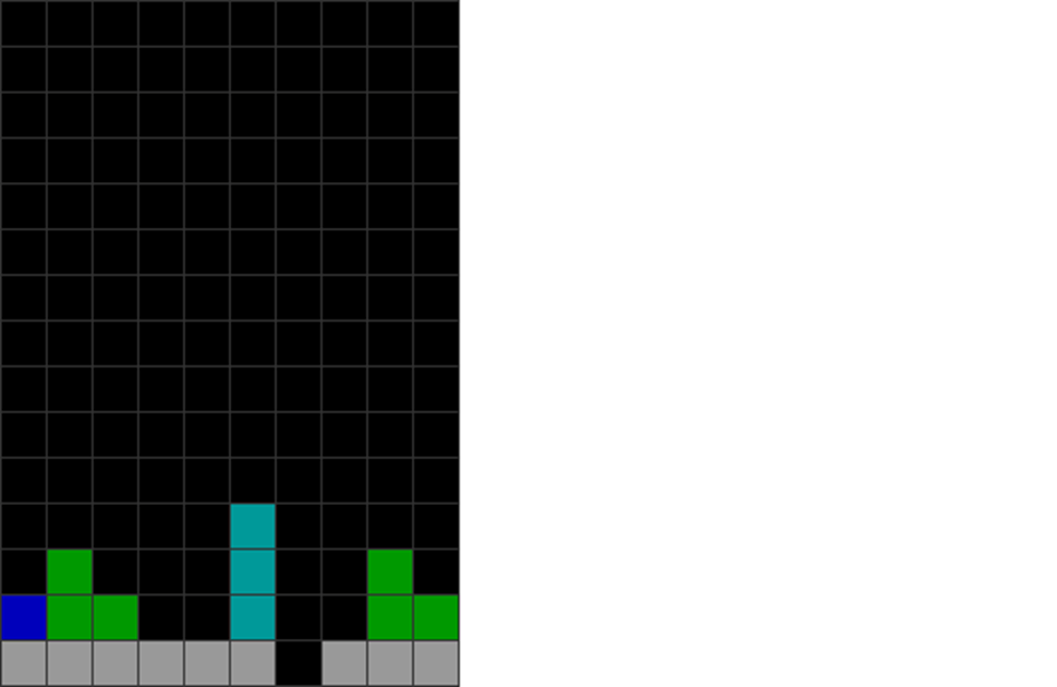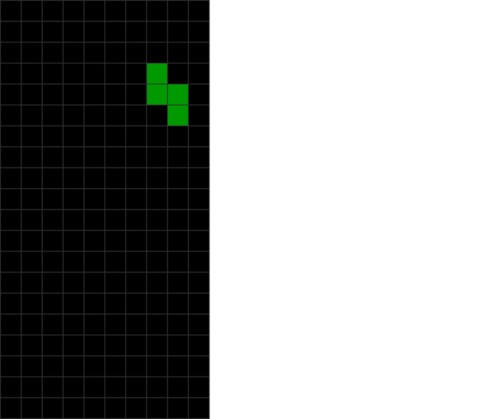 | The T piece spawns in its default column. The T piece will naturally fall to the bottom, depending on gravity. | The player presses “move right,” causing it to shift to the right by one block. |