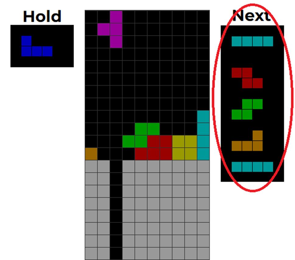 In some games, this preview may be on the top. This preview shows the incoming pieces chronologically: I, Z, S, O, L, and I, respectively.