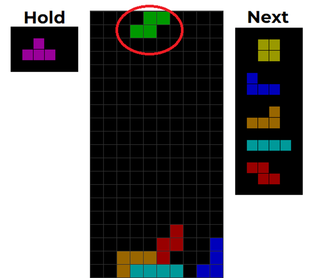 | The red-circled area marks the spawn zone (around row 20). If it’s blocked, the next piece can’t spawn and you top out. |