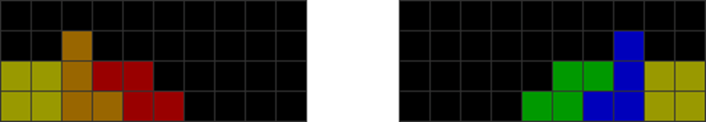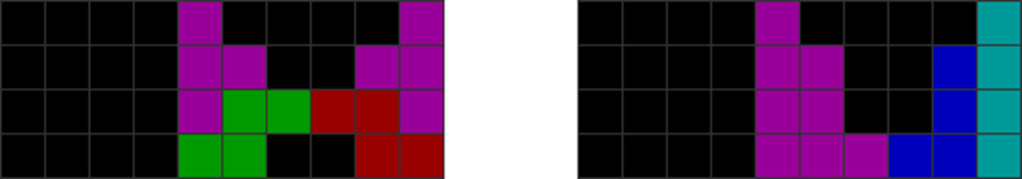 | This is the most common DT Cannon pattern if L and J come first. | This is used when either L or J comes late (or both). You can place S or Z vertically first, then soft drop L or J under them. |