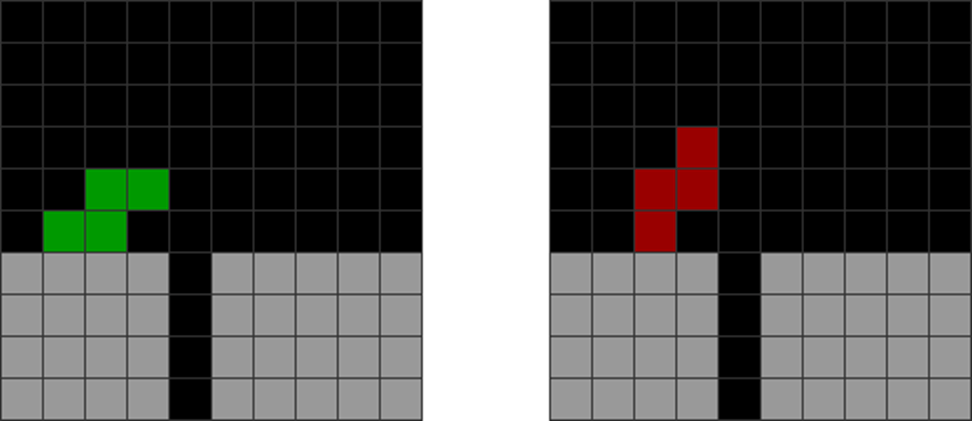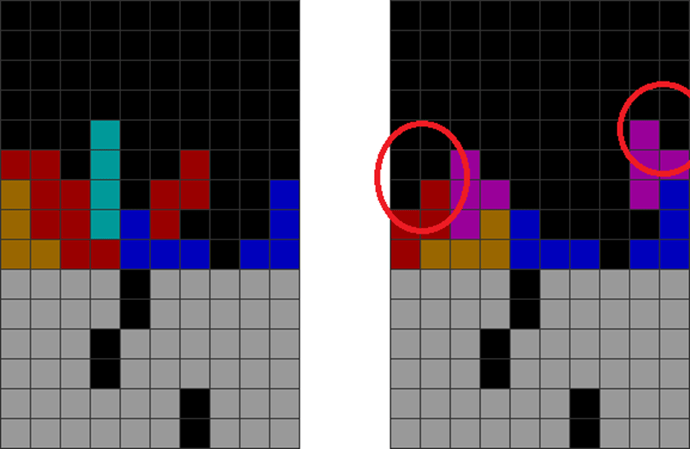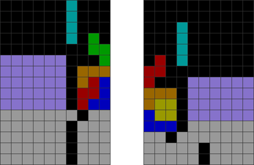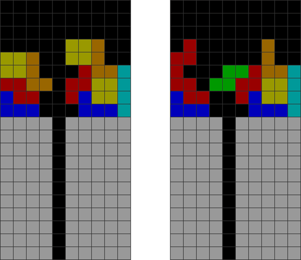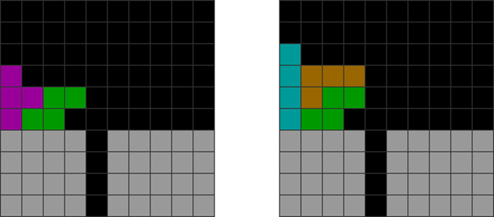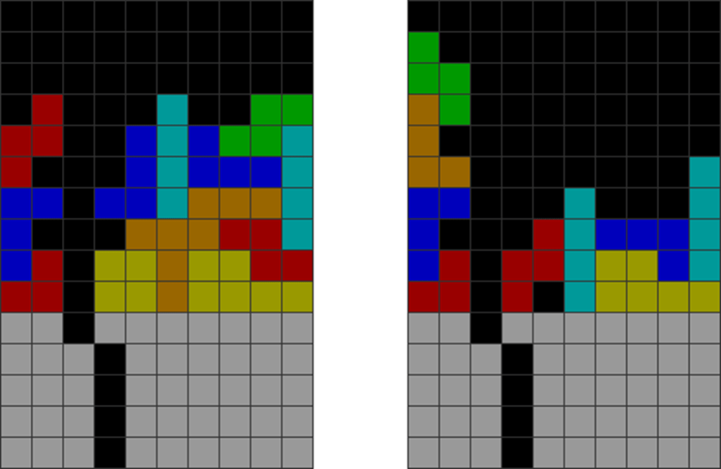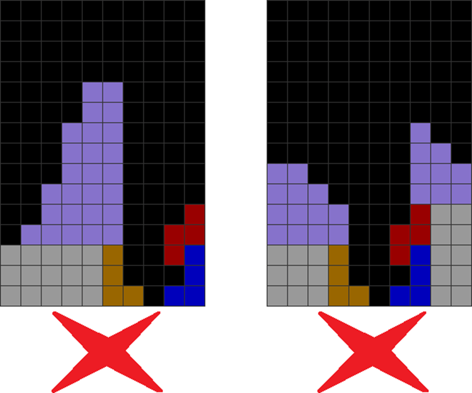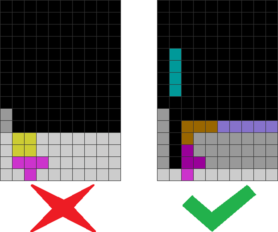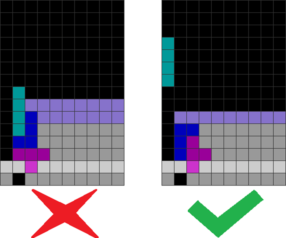It helps to understand each piece’s properties to combine them for optimal stack stability while making T-spin overhangs. The two situations below with the S and Z pieces are sometimes not optimal. Why?