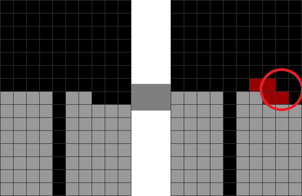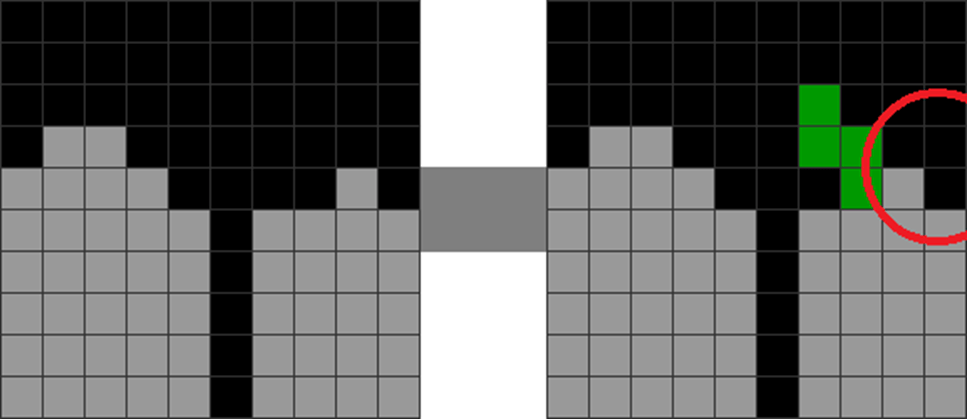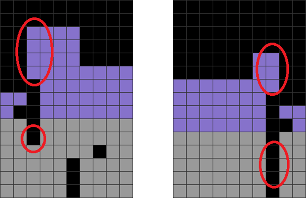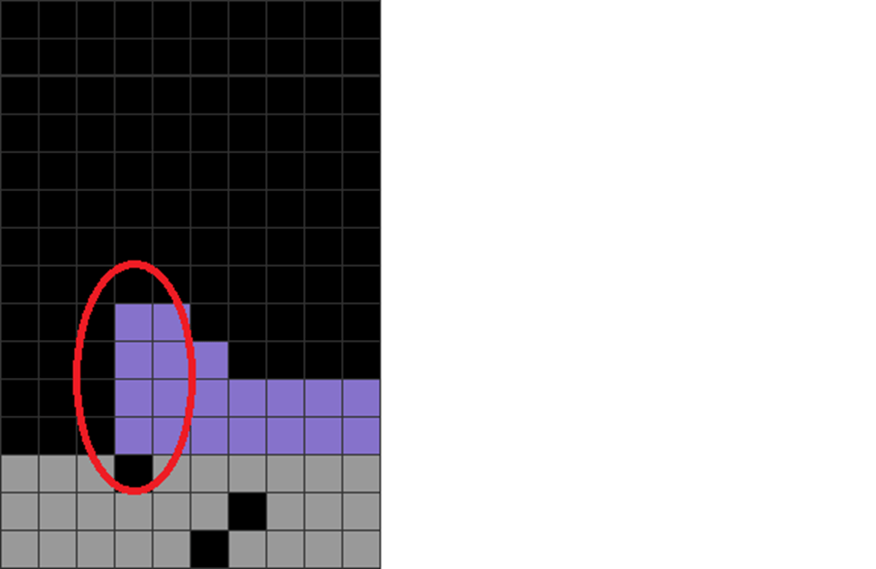 The player goes for the T-spin. However, this causes the red-circled areas to become jagged and unstable.