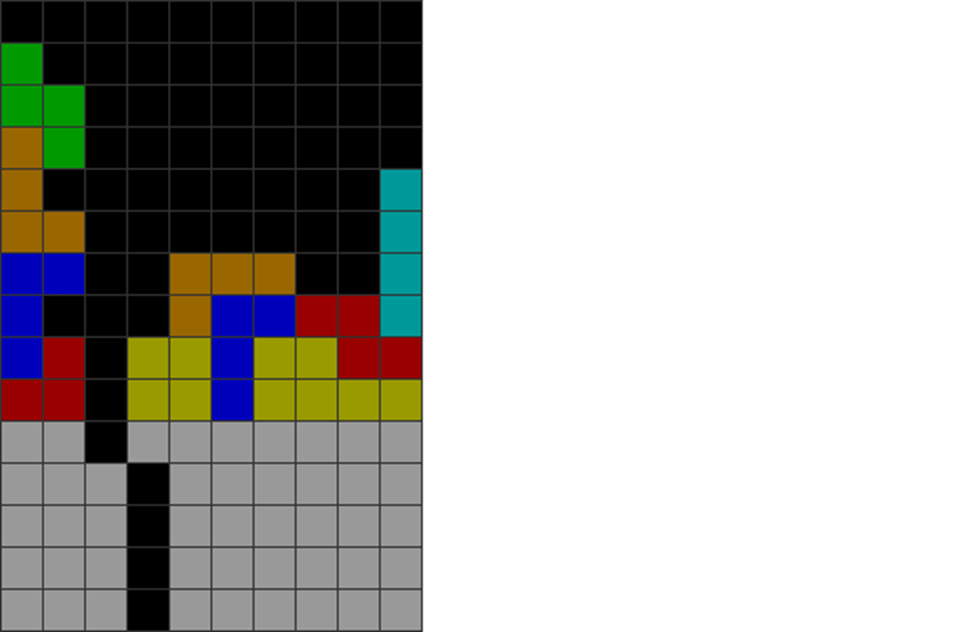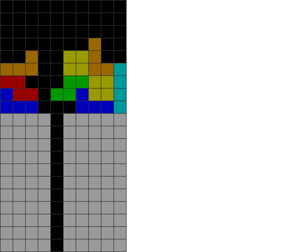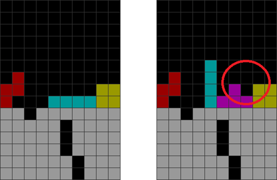 Here, the player couldn’t get the T in time and is forced to place incoming pieces over the holes as there’s nowhere else to put them.